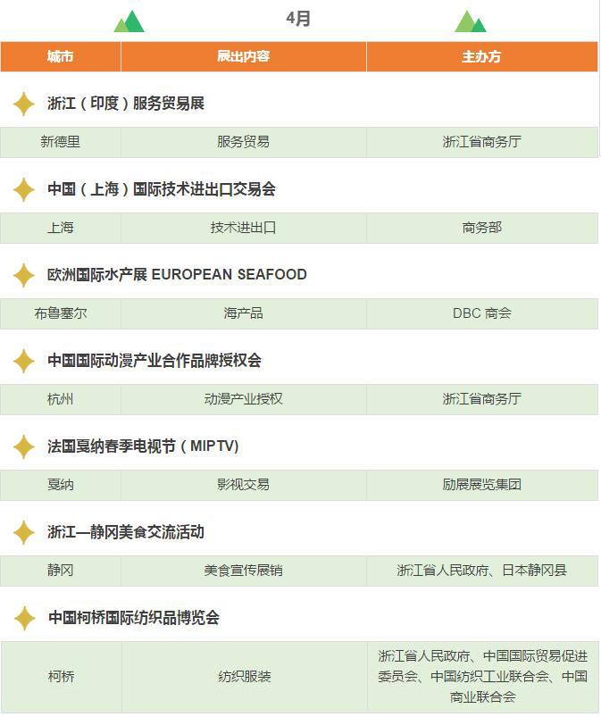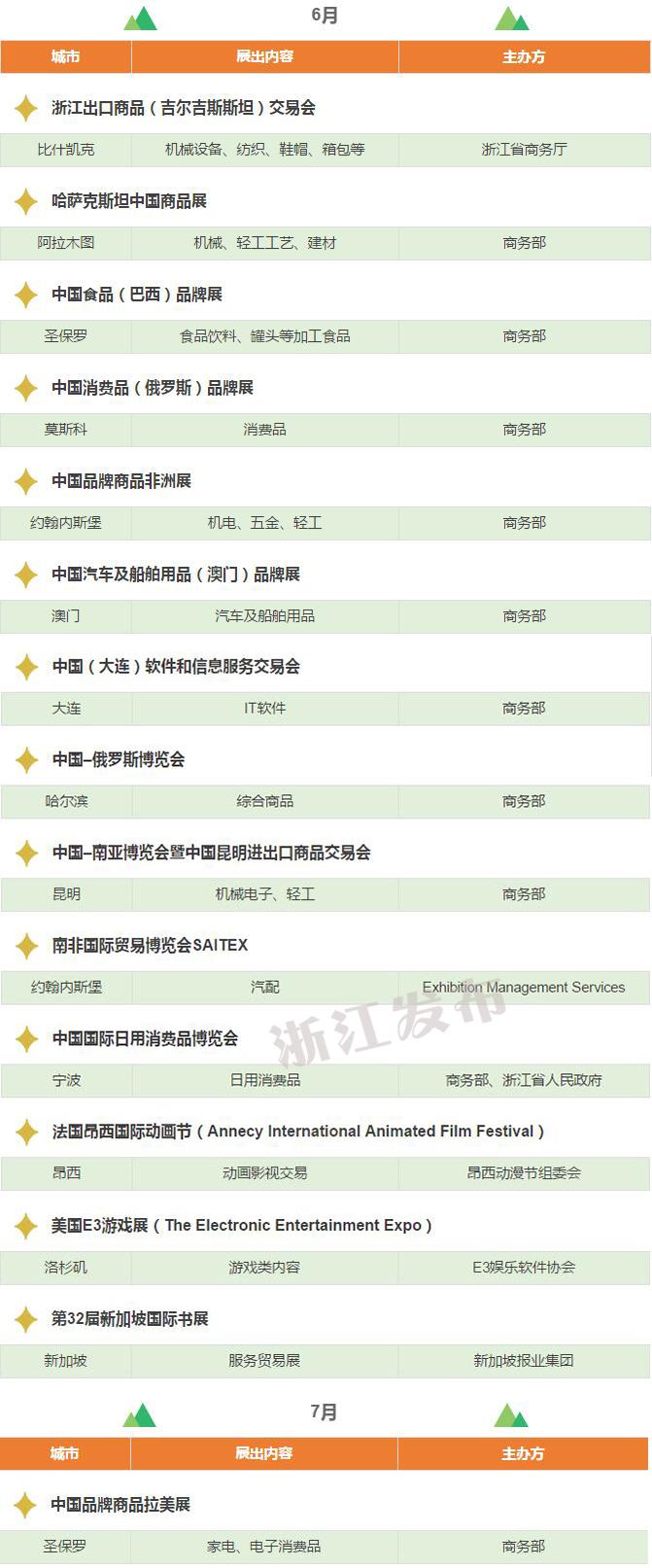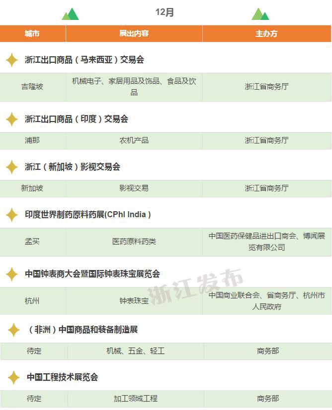 2017年,浙江將重點(diǎn)舉辦和支持96個(gè)展會(huì),其中自辦類(lèi)貨物貿(mào)易展會(huì)12個(gè),自辦類(lèi)服務(wù)貿(mào)易展會(huì)5個(gè),境外政策性重點(diǎn)展17個(gè),境內(nèi)政策性重點(diǎn)展11個(gè),其他類(lèi)重點(diǎn)展36個(gè),商貿(mào)流通展會(huì)15個(gè)!
