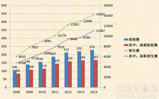 圖2. 歷年開設(shè)會(huì)展專業(yè)院校數(shù)和招生數(shù)變化情況(2008-2014)