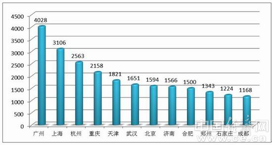 報(bào)告指出:我國(guó)會(huì)展教育集中度較高,廣州榮登首席寶座。2014年, 全國(guó)229所會(huì)展院校分布在66個(gè)城市。其中會(huì)展專業(yè)在校生人數(shù)超過1000人的有12個(gè)城市,在校生首位城市由廣州替代了上海,上海退居第二。3-12位依次是杭州、重慶、天津、武漢、北京、濟(jì)南、合肥、鄭州、石家莊、成都(圖4)。12市在校生合計(jì)為23722人,占全國(guó)56.7%。其中教育規(guī)模超過2000人的廣州、上海、杭州、重慶4市,就占了全國(guó)的1/3(32.7%)。