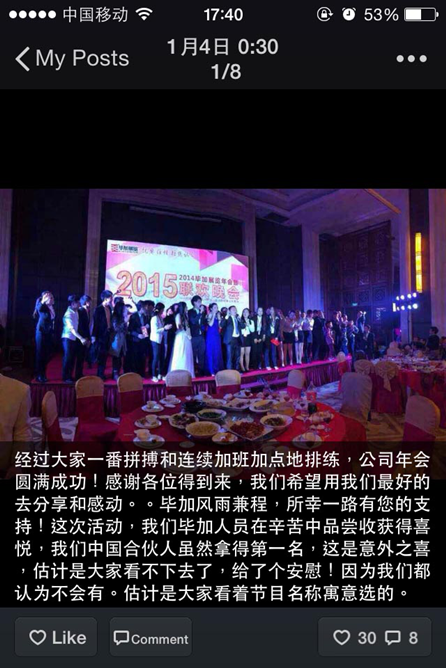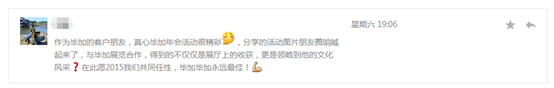 2014畢加展覽年會暨2015聯(lián)歡晚會雖然結(jié)束了,但是朋友圈依然熱火朝天,院校、供應(yīng)商、工廠等朋友們都給了畢加“10086”個贊,紛紛給畢加人發(fā)來賀電,給畢加公司送來祝福。畢加人在年會上精彩的表現(xiàn)讓人眼前一亮,作為一家展覽行業(yè)的標(biāo)桿企業(yè),來年的我們一定會以實際行動履行我們的承諾,給予客戶更好的設(shè)計與服務(wù)。這次年會,在畢加角度上講,這就像一個強力馬達,不斷驅(qū)動著我們往目標(biāo)前進。柏拉圖說:漫無目的的生活就像出海航行而沒有指南針。航海沒有指南針,就是一艘船在海上航行,沒方向,那有可能遇上大風(fēng)浪,暴雨,暗礁,隨時沉沒死亡。一條條的評價聚集在一起,讓畢加展覽這艘豪輪有了一個風(fēng)向標(biāo),始終瞧著目標(biāo)前進。