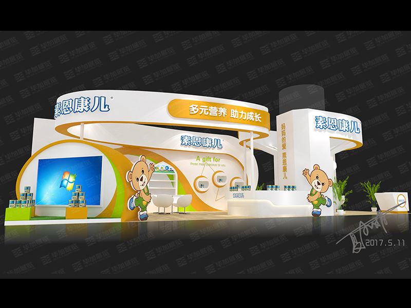 契合素恩康兒品牌形象和產(chǎn)品特性,采用立體結(jié)構(gòu),再搭配卡通造型和燈具燈光的效果,襯托出展位溫馨、活潑的氛圍。