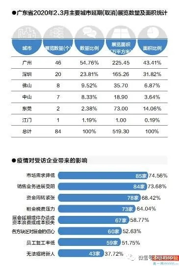 廣東會(huì)展組展企業(yè)協(xié)會(huì)對(duì)會(huì)員的問(wèn)卷調(diào)查顯示,截至3月底,省內(nèi)已經(jīng)有不少于100個(gè)展會(huì)確定取消和延期,現(xiàn)在2月和3月的肯定都取消或者延期了,而4月和5月的情況還不明朗,上述數(shù)字還可能繼續(xù)增加。目前廣州的一些行業(yè)品牌大展如廣州美博會(huì)、廣州婚博會(huì)等已經(jīng)明確全部延期,深圳的傳統(tǒng)大展如深圳機(jī)械展、深圳珠寶展等也一樣被迫推后。